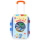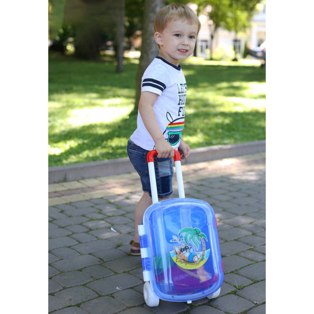 Такой чемодан интересный, функциональный и очень похож на настоящий «взрослый» чемодан. Яркий цвет, прозрачная крышка и симпатичная наклейка непременно привлекут внимание малышей к игрушке. Изображение на крышке нанесено по технологии IML (непосредственная инжекция рисунка). Такой рисунок не теряет яркости и является долговечным. Чемодан комфортный для детей разного возраста и роста благодаря ручке, которая регулируется. Открытая крышка фиксируется в нескольких положениях, поэтому ребенок сможет легко собирать и вынимать вещи из чемодана. А надежные защелки позволяют закрывать крышку и хранить игрушки внутри чемодана. Кроме того большие, крепкие колеса помогают малышам свободно перевозить чемодан.