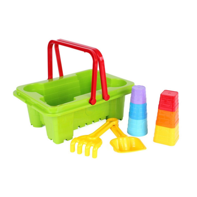 Предлагаем оригинальную игрушку «Набор для игры с песком», которую захочет иметь большинство малышей. С помощью этого набора можно «выложить» настоящую песчаную крепость! В набор входят функциональное ведерко-пасочка в форме крепости, лопатка, грабельки и формочки для песка разного размера. Перевернув ведерко, вы получите пластмассовую крепость, которую можно украсить другими формочками, входящими в комплект. Также, их можно складывать в разноцветные пирамидки. Особенность игрушки в том, что использовать ее интересно не только в песочнице или на берегу моря, но и дома, во дворе.