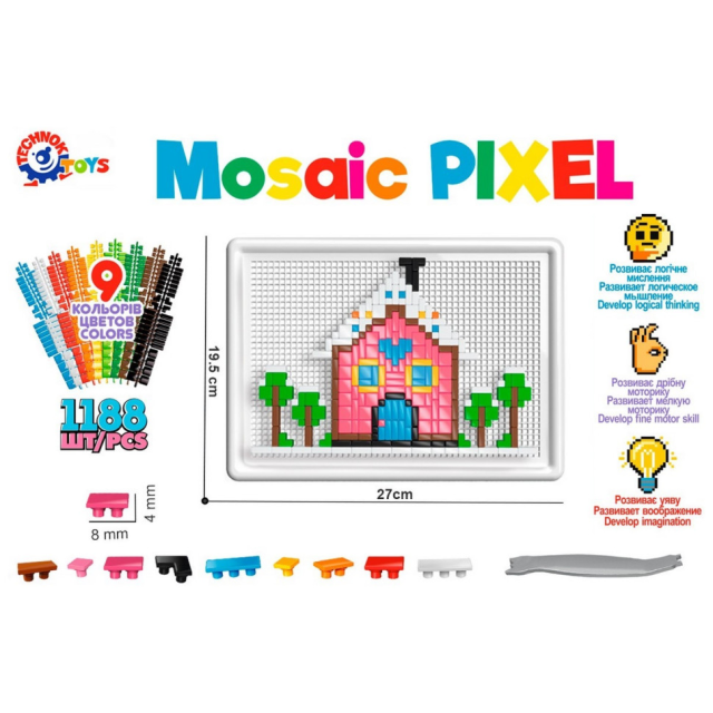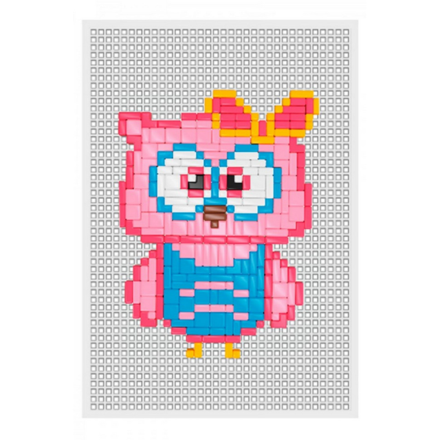 Как собрать мозаику? Рисунок выкладывается на пластиковое поле мелкими фишками различных форм. Всего в комплекте 1188 элементов девяти цветов! Размер самого маленького квадратика 4х4 мм. В помощь детям есть специальный инструмент, которым удобно вынимать фишки с поля. Для юных творцов в наборе есть инструкция, согласно которой можно собрать милую розовую сову или домик под белым снегом. Собрав рисунки по инструкции, потом можно собирать собственные, которые подскажет фантазия.