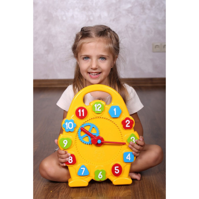 Часы помогут малышу научиться определять время. На циферблате расположены геометрические фигурки с цифрами, которые вынимаются. Размер упаковки: 34х27х6 см.