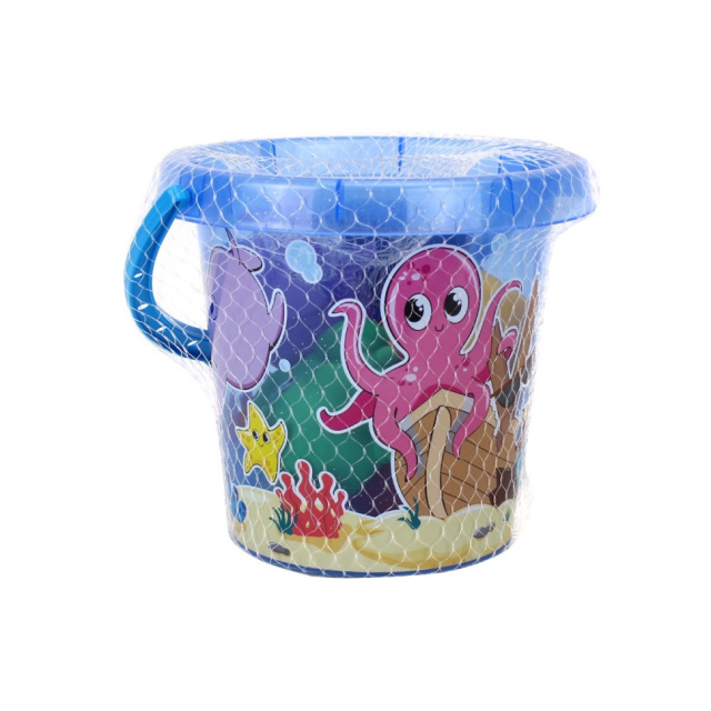 Особого внимания заслуживает эксклюзивный дизайн игрушки: ведерко в наборе изготовлены из прозрачного пластика с блестками и украшен яркой наклейкой "морское дно". Изображение нанесено по технологии IML (непосредственная инжекция рисунка на игрушку). Такой рисунок не теряет яркости и, в отличие от наклейки, является долговечным.