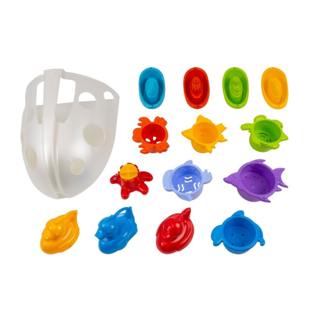 Все игрушки упакованы в специальный органайзер, являющийся отличным сочетанием функционального контейнера для хранения в ванной комнате и интересной игрушки. Игрушки в органайзере удобно промыть под водой и прикрепить на стену. Благодаря отверстиям вода быстро стекает и игрушки хорошо высыхают. При таком хранении они не плесневеют, не загрязняются и всегда под рукой.