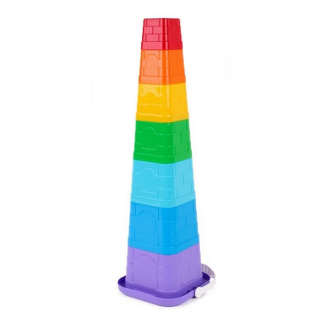 Пирамидка состоит из семи элементов разных цветов и размеров. Рельеф и форма элементов имитируют башни средневекового замка - с окнами, дверями и каменной кладкой.